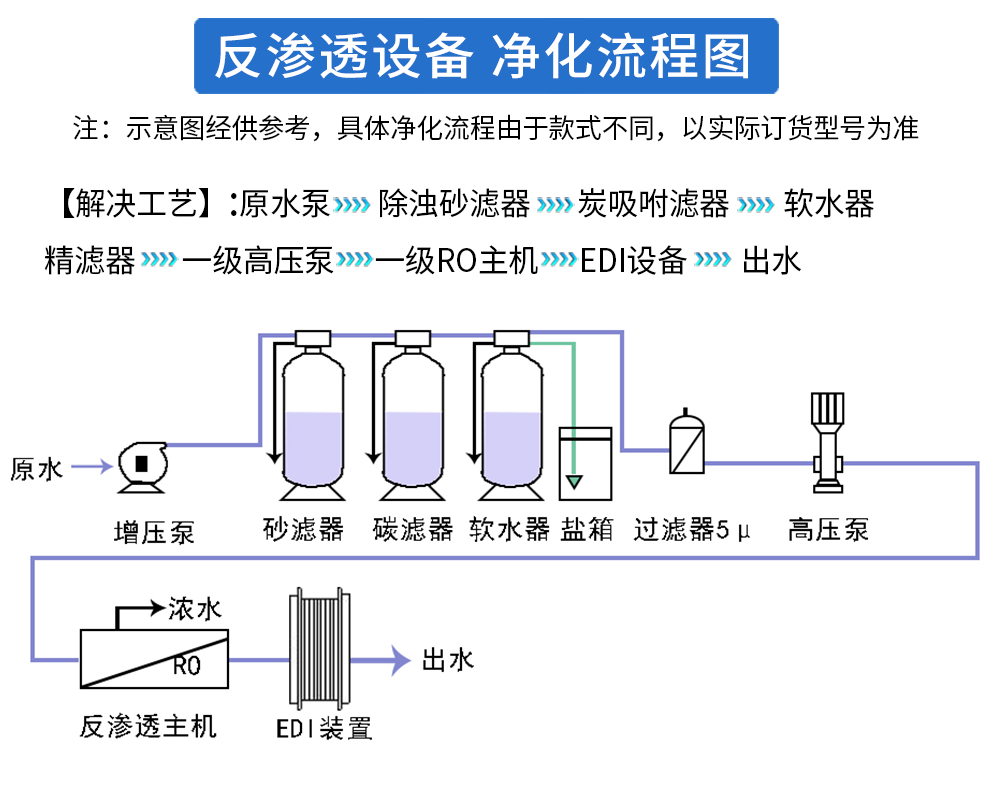 原水箱—原水增压泵—石英砂过滤器—活性碳过滤器—软化过滤器--保安过滤器—一级高压泵--反渗透膜—一级反渗透设备—水箱—PH调节装置—二级高压泵—反渗透膜--二级反渗透装置—纯水箱—EDI增压泵—EDI模块—终端精密过滤器—高纯水箱(出水电阻率10兆欧以上),三种方案各有利弊,每个用户可以根据自身不同的需求来选择用什么样的方案。
