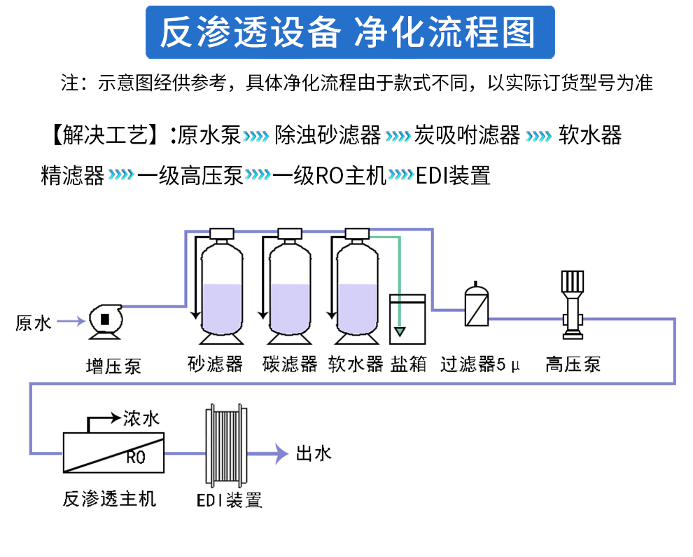 ●预处理-二级反渗透-中间水箱-水泵-EDI装置-纯化水箱-纯水泵-紫外线杀菌器-0.2或0.5μm精密过滤器-用水对象