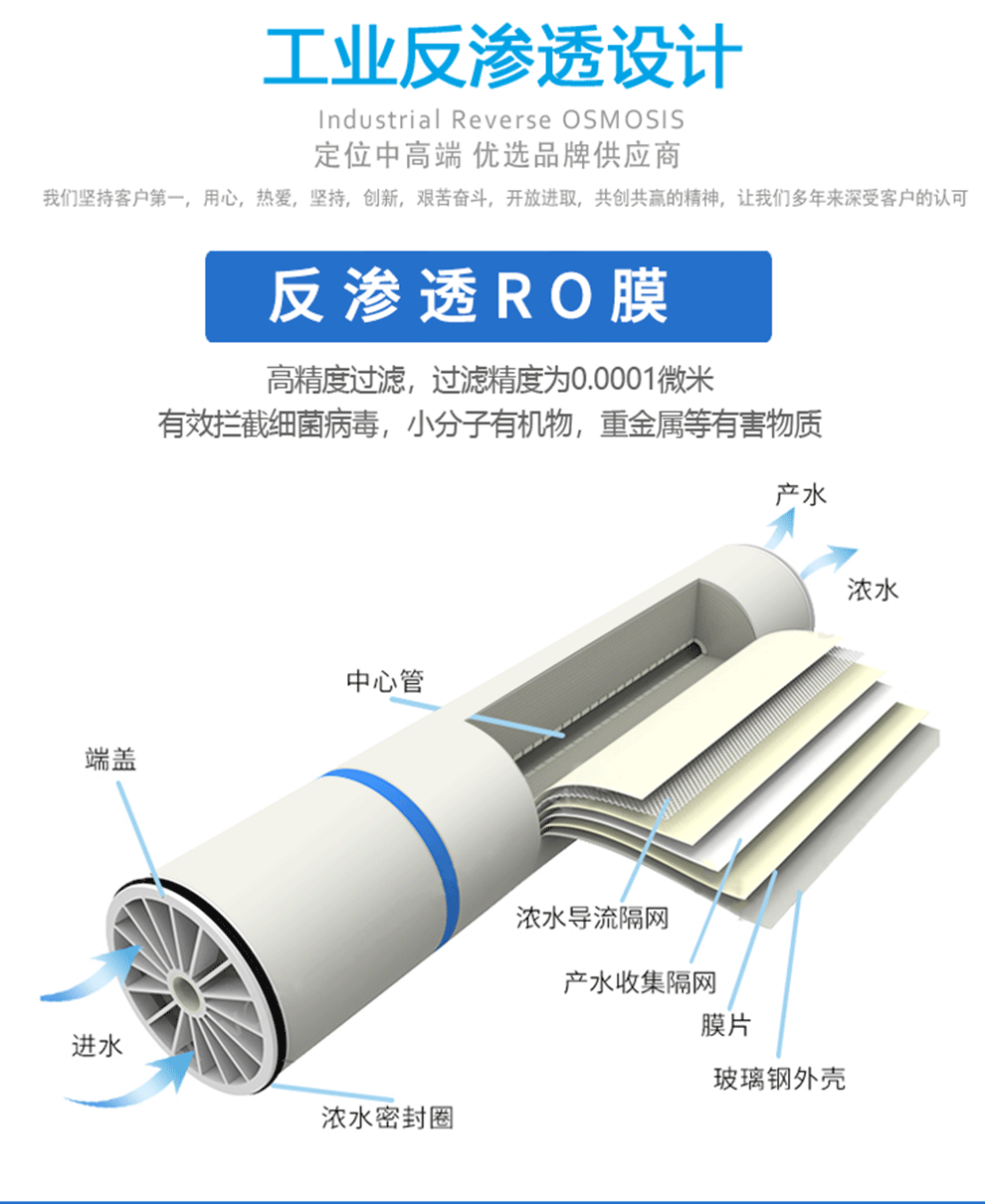 工业纯水设备(外文译名 Pure water one),它采用的是主要是反渗透膜技术。它的工作原理是对水施加一定的压力,使水分子和离子态的矿物质元素通过反渗透膜,而溶解在水中的绝大部分无机盐(包括重金属)、有机物以及细菌、病毒等无法透过反渗透膜,从而使渗透过的纯净水和无法渗透过的浓缩水严格的分开;反渗透膜上的孔径只有0.0001微米,而病毒的直径一般有0.02-0.4微米,普通细菌的直径有0.4-1微米。