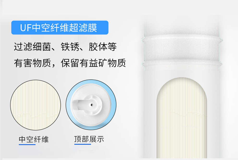 自来水先进入超滤膜管内,在水压差的作用下,膜表面上密布的许多0.01微米的微孔只允许水分子、有益矿物质和微量元素透过,成为净化水。而细菌、铁锈、胶体、泥沙、悬浮物、大分子有机物等有害物质则被截留在超滤膜管内,在超滤膜进行冲洗时排出。
