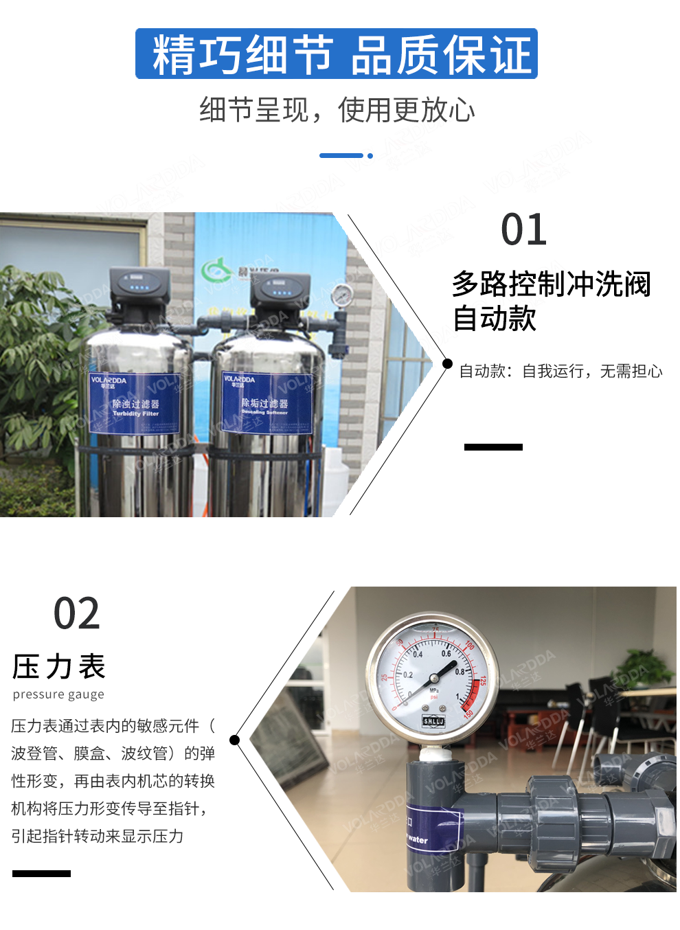 利用石英砂滤料的截留、滤除作用,去除大粒径的杂质颗粒、浓度胶体和悬浮物是一种常见方式,具有低成本、操作维护及管理方便等特点。过滤精度高,有效去除胶体颗粒及高分子有机物;常温操作、耐酸碱、氧化,配置完善检测仪表,实现自动和手动双重控制。
