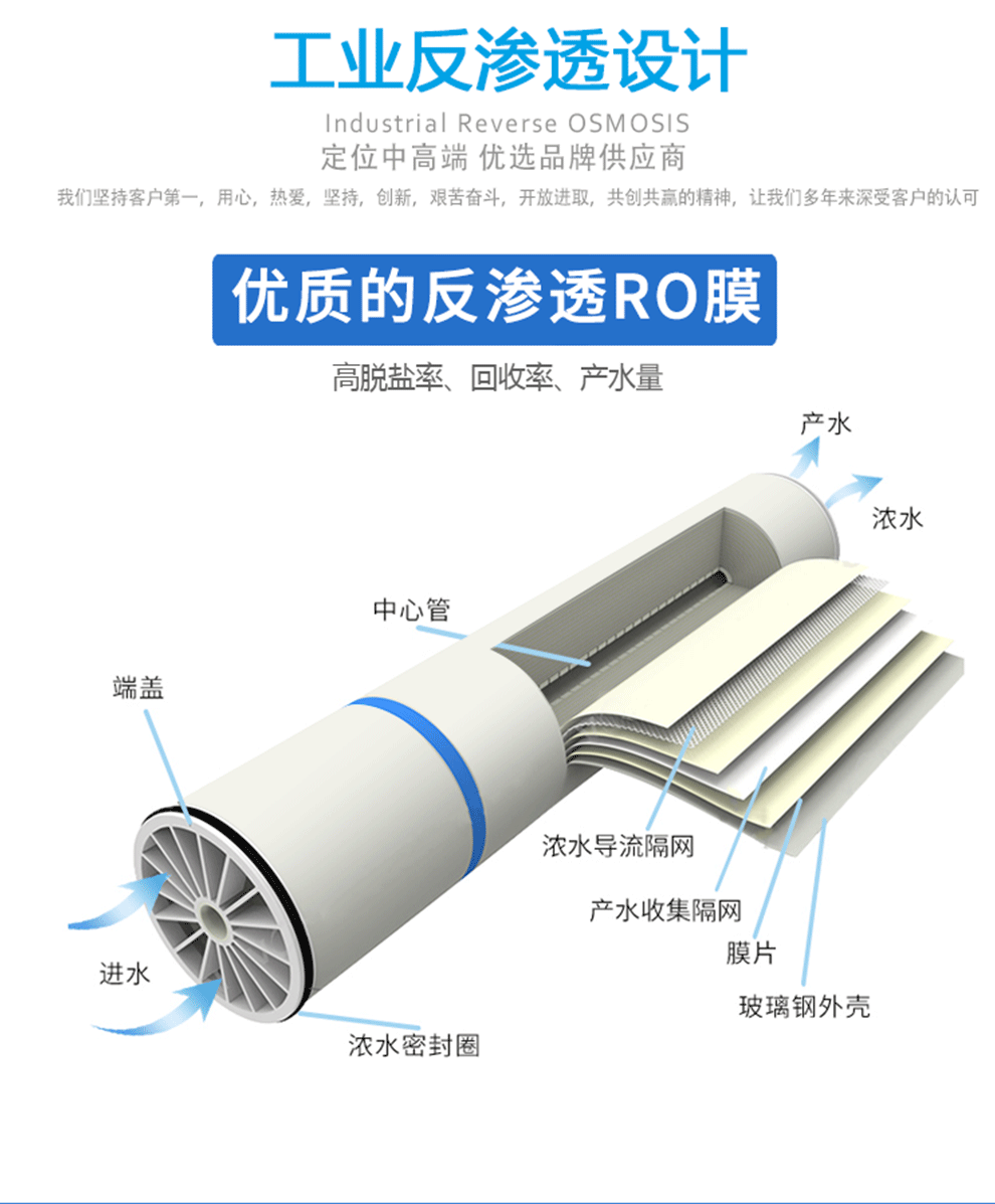 RO反渗透设备是利用足够的压力使溶液中的溶剂(一般常指水)通过反渗透膜(一种半透膜)而分离出来,方向与渗透方向相反,可使用大于渗透压的反渗透法进行分离、提纯和浓缩溶液。利用反渗透技术可以有效的去除水中的溶解盐、胶体,细菌、病毒、细菌内毒素和大部分有机物等杂质。反渗透膜的主要分离对象是溶液中的离子范围,无需化学品即可有效脱除水中盐份,系统除盐率一般为98%以上。
