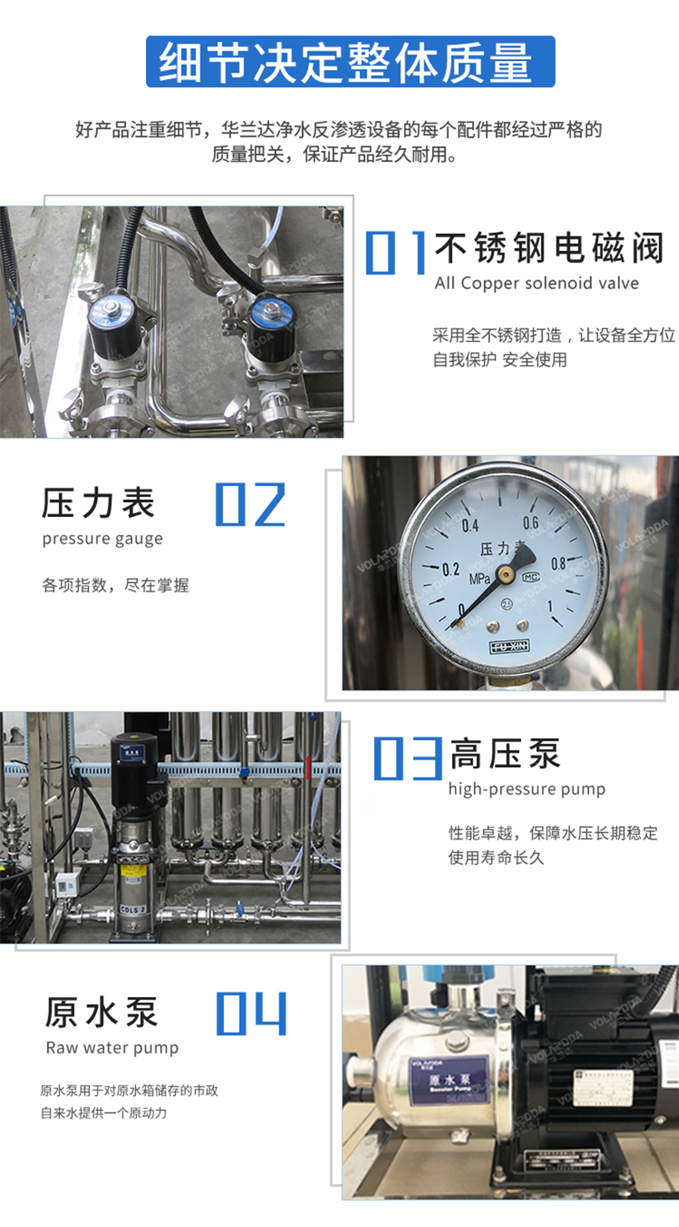 根据自身行业需要,选择配置还是经济型配置,指主要部分采用不锈钢还是玻璃钢,水泵要国产的还是进口的,反渗
