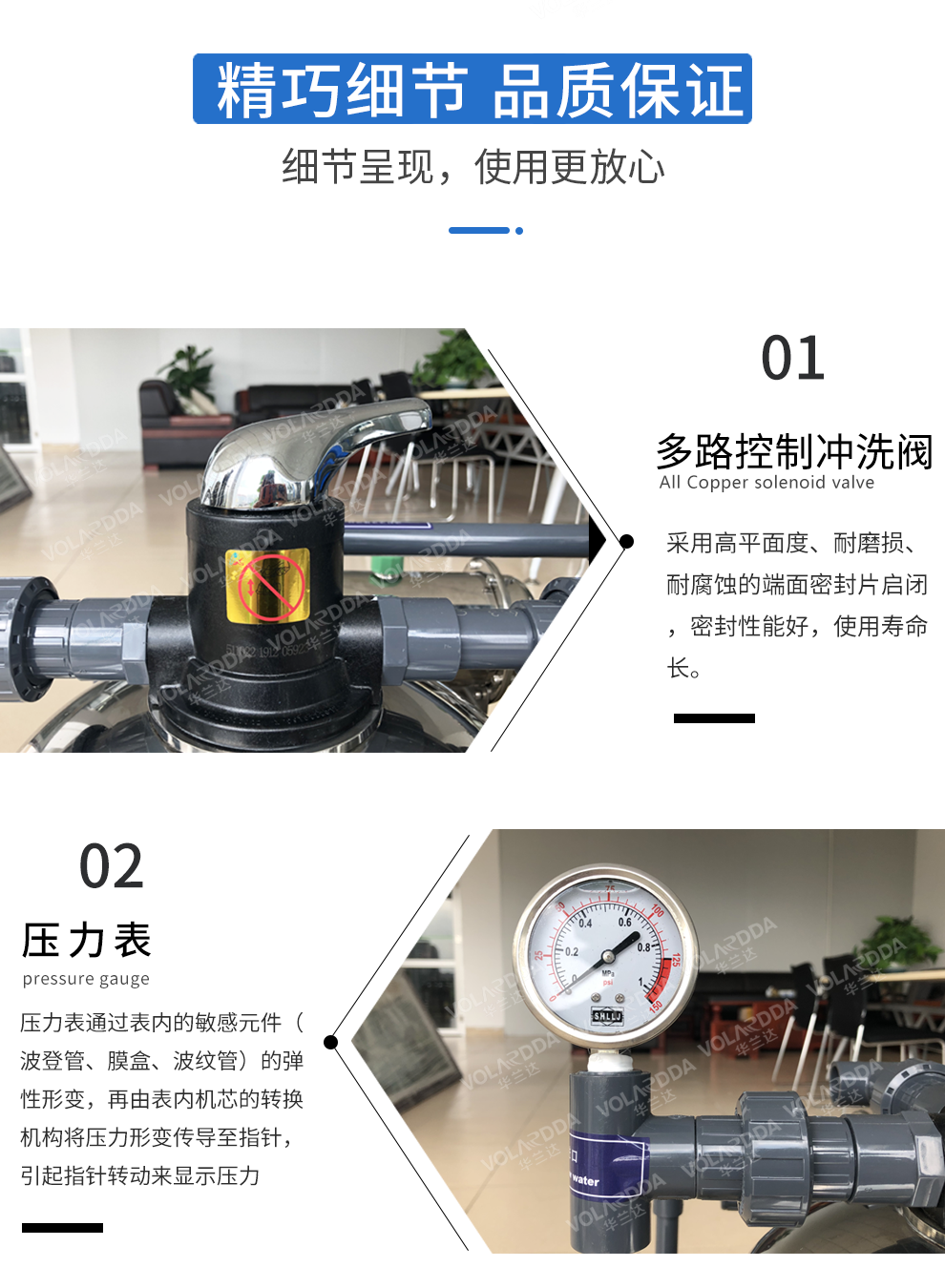 利用石英砂滤料的截留、滤除作用,去除大粒径的杂质颗粒、浓度胶体和悬浮物是一种常见方式,具有低成本、操作维护及管理方便等特点。过滤精度高,有效去除胶体颗粒及高分子有机物;常温操作、耐酸碱、氧化,配置完善检测仪表,实现自动和手动双重控制。