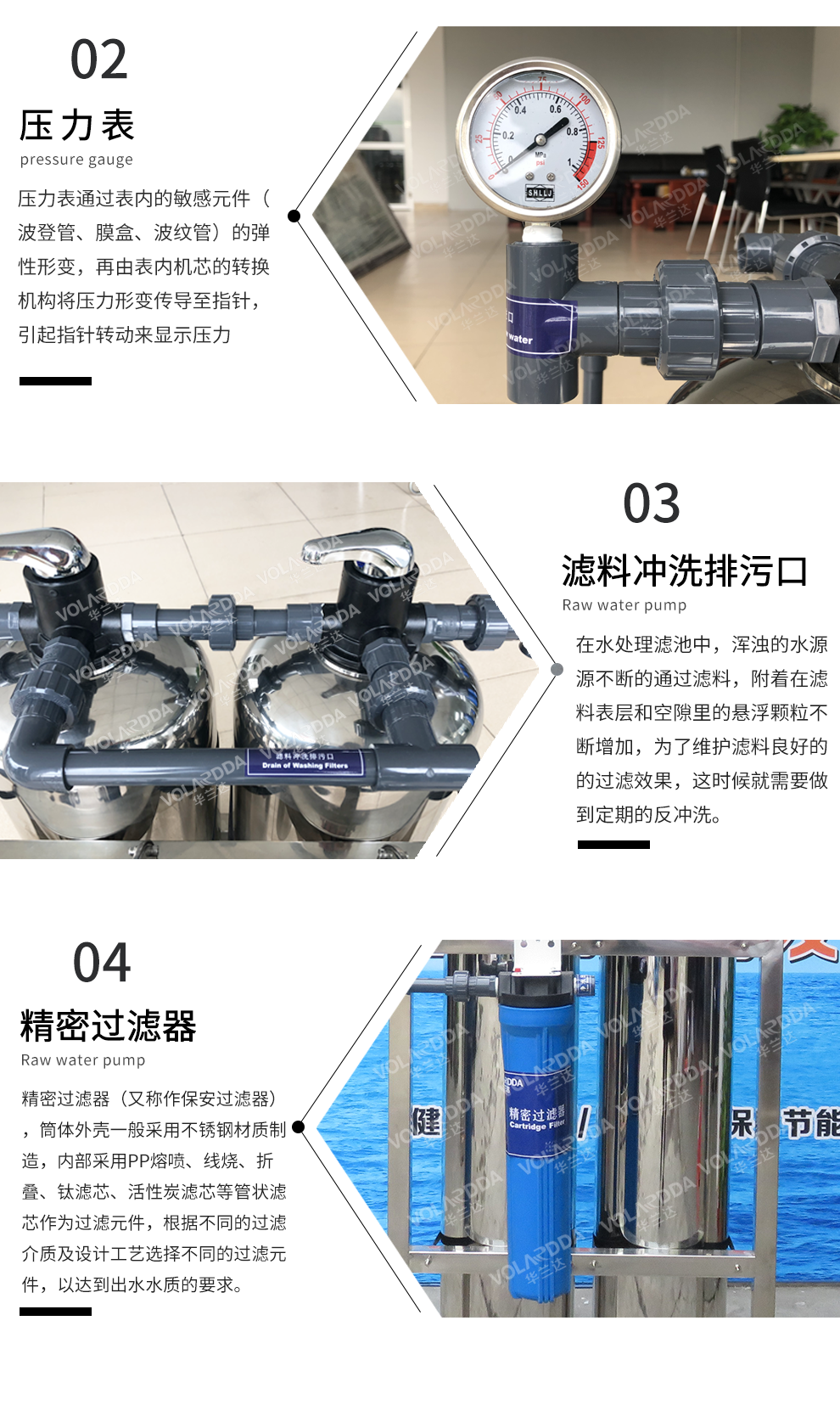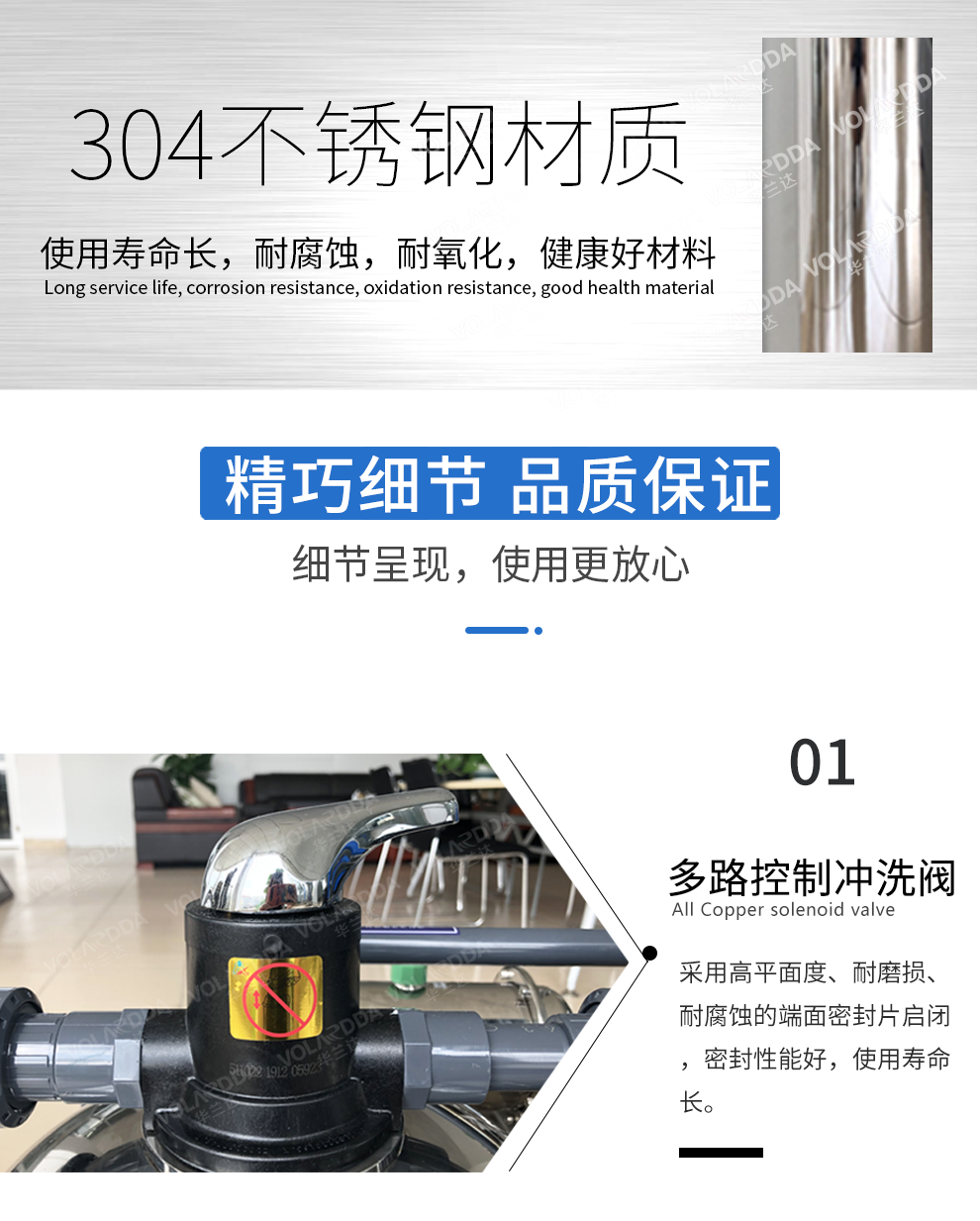 利用石英砂滤料的截留、滤除作用,去除大粒径的杂质颗粒、浓度胶体和悬浮物是一种常见方式,具有低成本、操作维护及管理方便等特点。过滤精度高,有效去除胶体颗粒及高分子有机物;常温操作、耐酸碱、氧化,配置完善检测仪表,实现自动和手动双重控制。