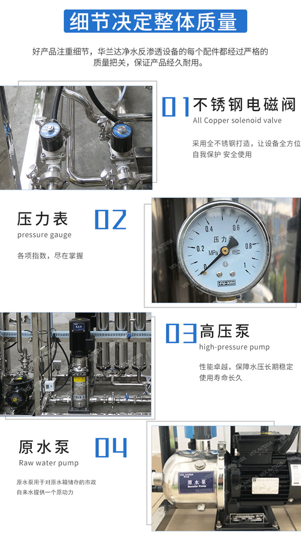 根据自身行业需要,选择配置,指主要部分采用不锈钢还是玻璃钢,水泵要国产的还是进口的,反渗