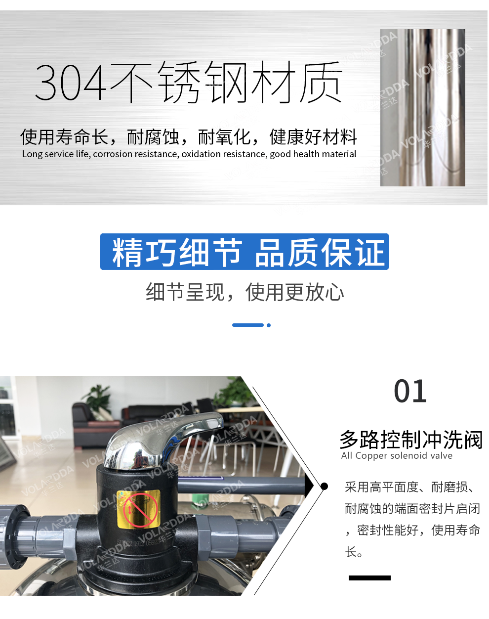 石英砂过滤器是一种压力式过滤器,利用过滤器内所填充的优质石英砂滤料,进水自上而下流经滤层时,水中的悬浮物及粘胶质颗粒被去除,从而使水的浊度降低。