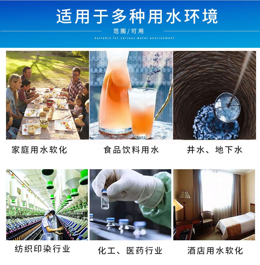 去除水中的硬度杂质Ca、Mg等离子,降低水质硬度实现软化,烧水没有水垢,适用于占用水总量95%的生活用水,对洗浴、美容、洗涤衣物、热水器及壁挂炉等家电的日常维护有好处。